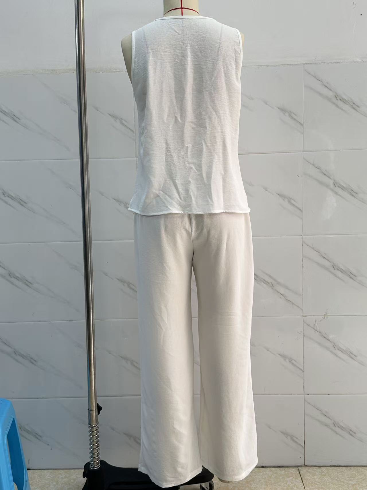 Round-neck Solid-color Fashionable Womens Casual Cotton-Linen Vest And Pants Set